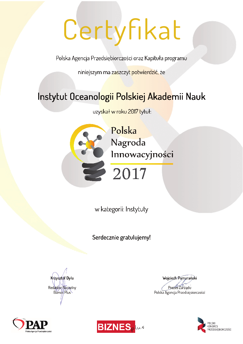 Instytut Oceanologii Polskiej Akademii Nauk za projekt "Platforma Transferu Wiedzy FindFish" otrzymał POLSKĄ NAGRODĘ INNOWACYJNOŚCI 2017. Wręczenie nagród odbyło się DNIA 26.10.2017 na V Polskim Kongresie Przedsiębiorczości 26-27.10 Zielona Góra. |