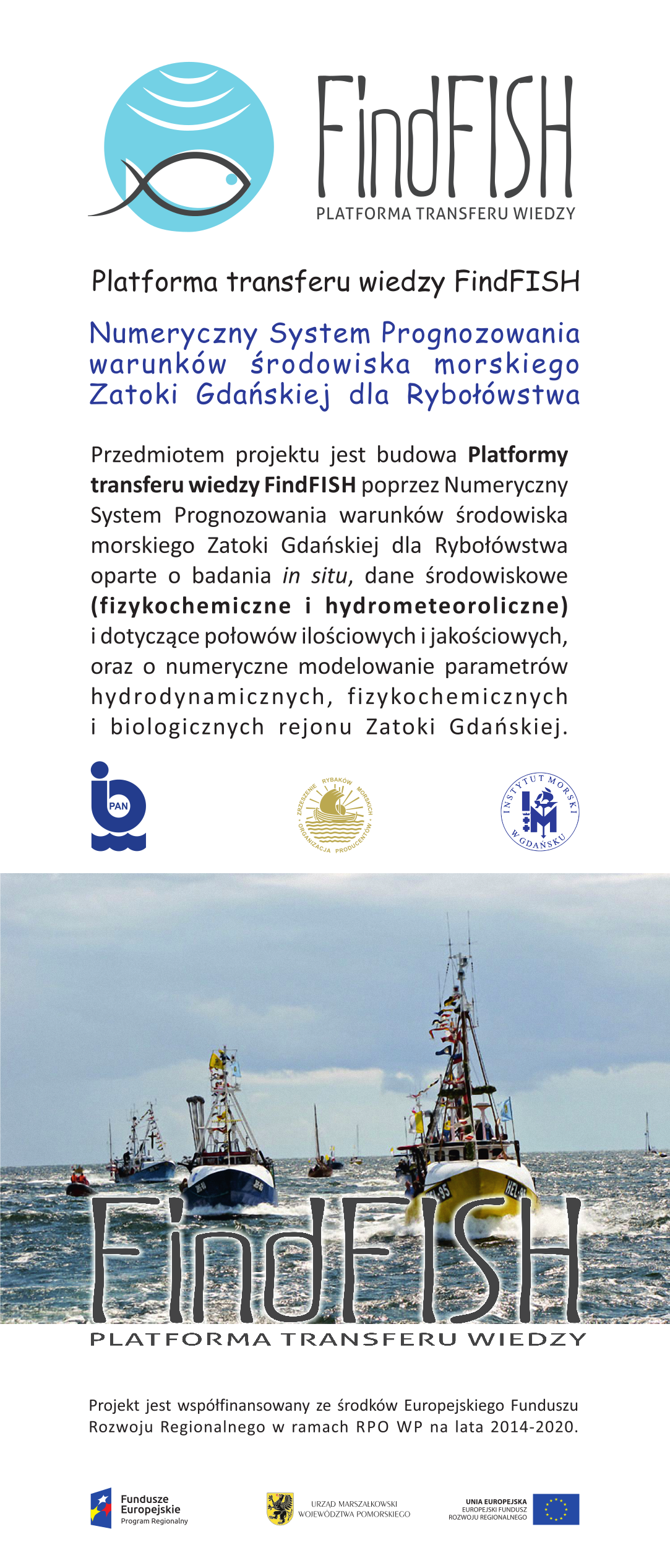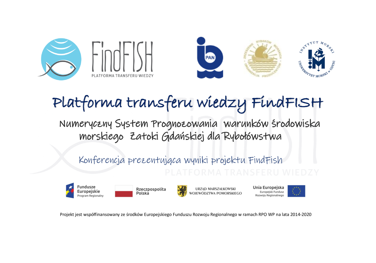 W dniu 13 maja 2022 r. o godz. 10.00 w Centralnym Ośrodku Sportu, Ośrodek Przygotowań Olimpijskich im. Feliksa Stamma, Cetniewo we Władysławowie, odbyła się Konferencja prezentująca wyniki badań wykonanych w ramach projektu "Platforma transferu wiedzy FindFish - Numeryczny System Prognozowania warunków środowiska morskiego Zatoki Gdańskiej dla Rybołówstwa" zorganizowana przez Zrzeszenie Rybaków Morskich - Organizacja Producentów we Władysławowie i Instytut Oceanologii Polskiej Akademii Nauk. W konferencji udział wzięli, oprócz wykonawców projektu, licznie Rybacy oraz goście zaproszeni, Pani Profesor Magdalena Podolska, która wygłosiła wykład zaproszony, przedstawiciele Dyrekcji Lidera i Partnerów, Agencji Rozwoju Pomorza, Departamentu Rybołówstwa MRiRW, władz lokalnych, Organizacji Polskich Producentów i Przetwórców Ryb i innych instytutów naukowo-badawczych: Morskiego Instytutu Rybackiego - PIB i Instytutu Oceanografii Uniwersytetu Gdańskiego.