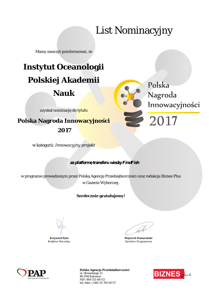 Instytut Oceanologii Polskiej Akademii Nauk za projekt "Platforma Transferu Wiedzy FindFish" otrzymał POLSKĄ NAGRODĘ INNOWACYJNOŚCI 2017. Wręczenie nagród odbyło się DNIA 26.10.2017 na V Polskim Kongresie Przedsiębiorczości 26-27.10 Zielona Góra. |
