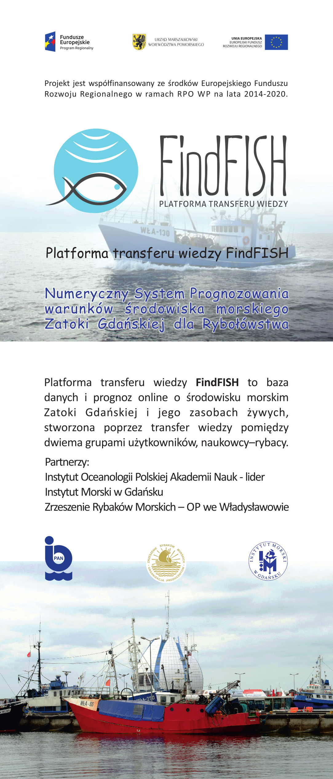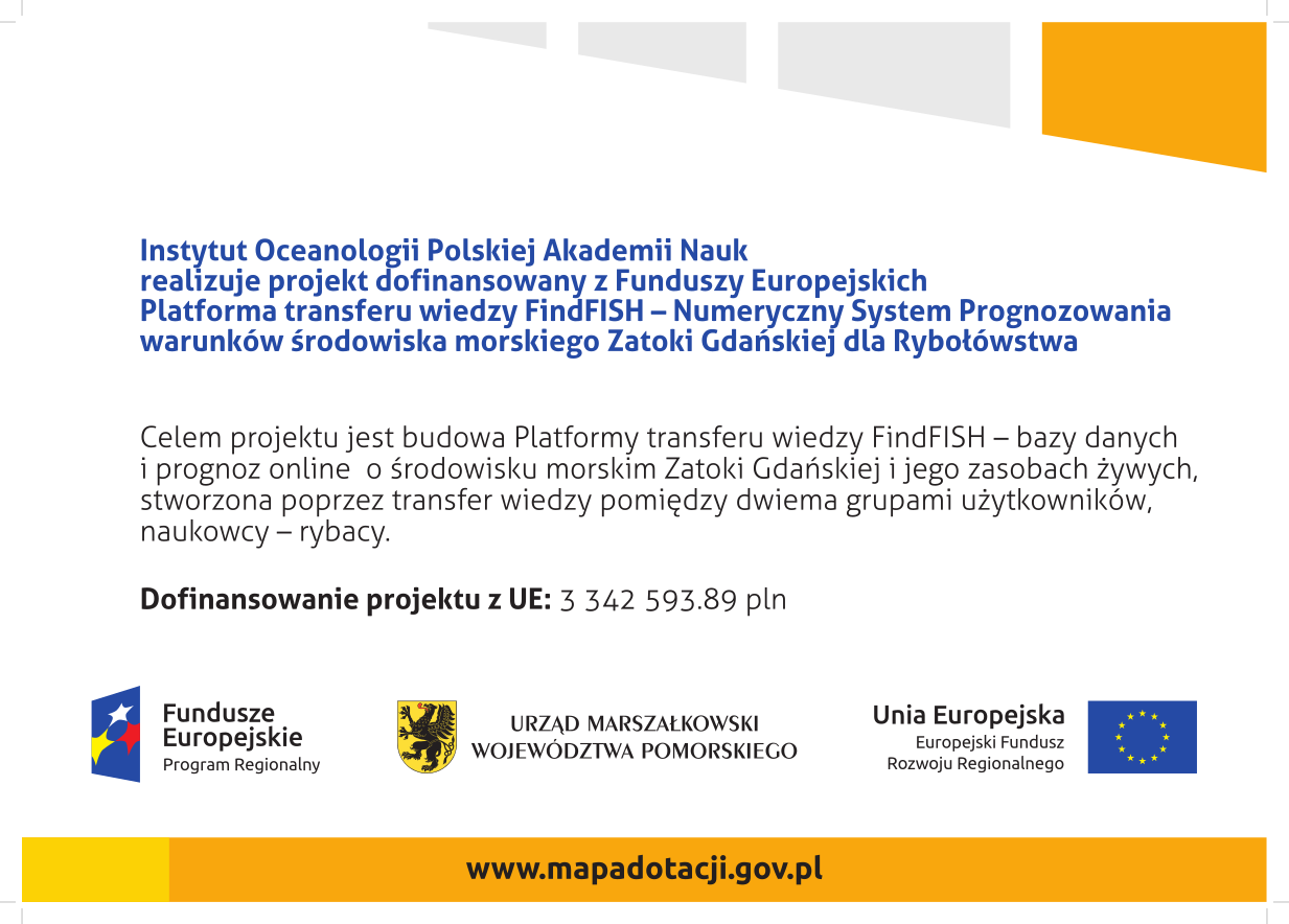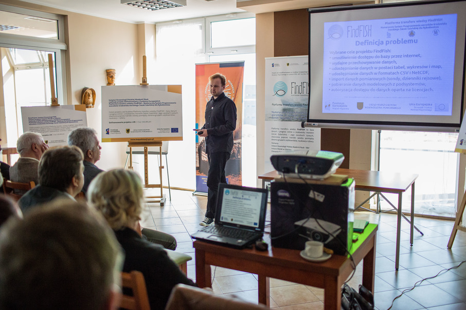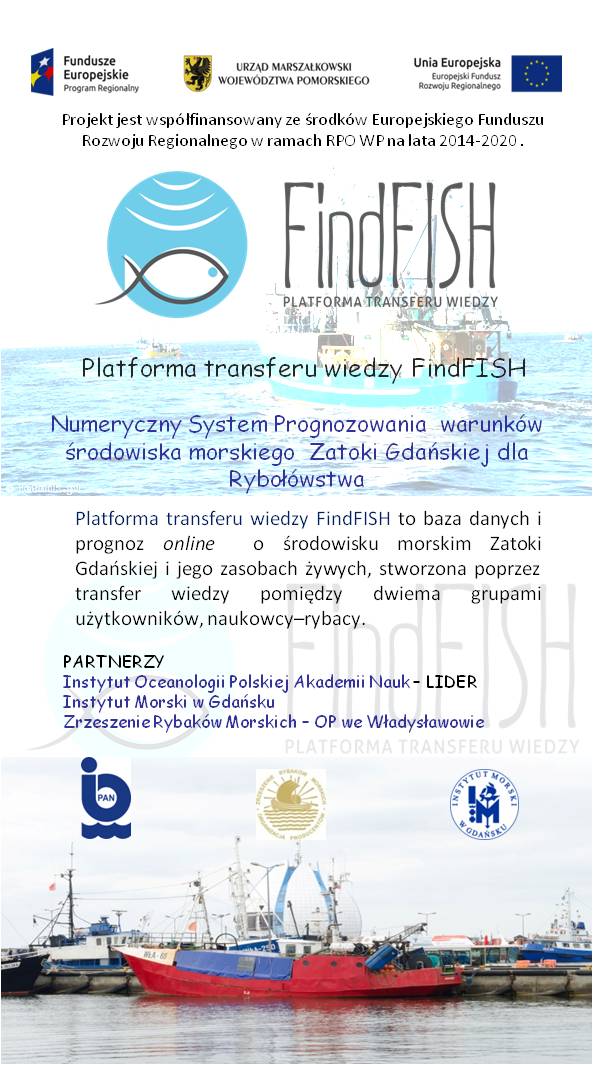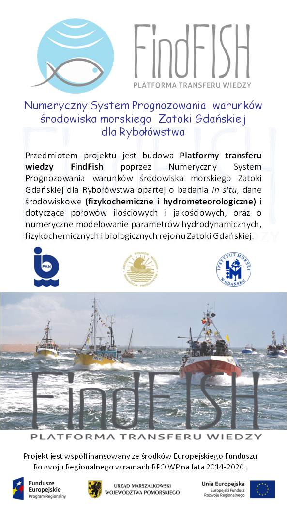 W dniu 13 maja 2022 r. o godz. 10.00 w Centralnym Ośrodku Sportu, Ośrodek Przygotowań Olimpijskich im. Feliksa Stamma, Cetniewo we Władysławowie, odbyła się Konferencja prezentująca wyniki badań wykonanych w ramach projektu "Platforma transferu wiedzy FindFish - Numeryczny System Prognozowania warunków środowiska morskiego Zatoki Gdańskiej dla Rybołówstwa" zorganizowana przez Zrzeszenie Rybaków Morskich - Organizacja Producentów we Władysławowie i Instytut Oceanologii Polskiej Akademii Nauk. W konferencji udział wzięli, oprócz wykonawców projektu, licznie Rybacy oraz goście zaproszeni, Pani Profesor Magdalena Podolska, która wygłosiła wykład zaproszony, przedstawiciele Dyrekcji Lidera i Partnerów, Agencji Rozwoju Pomorza, Departamentu Rybołówstwa MRiRW, władz lokalnych, Organizacji Polskich Producentów i Przetwórców Ryb i innych instytutów naukowo-badawczych: Morskiego Instytutu Rybackiego - PIB i Instytutu Oceanografii Uniwersytetu Gdańskiego.